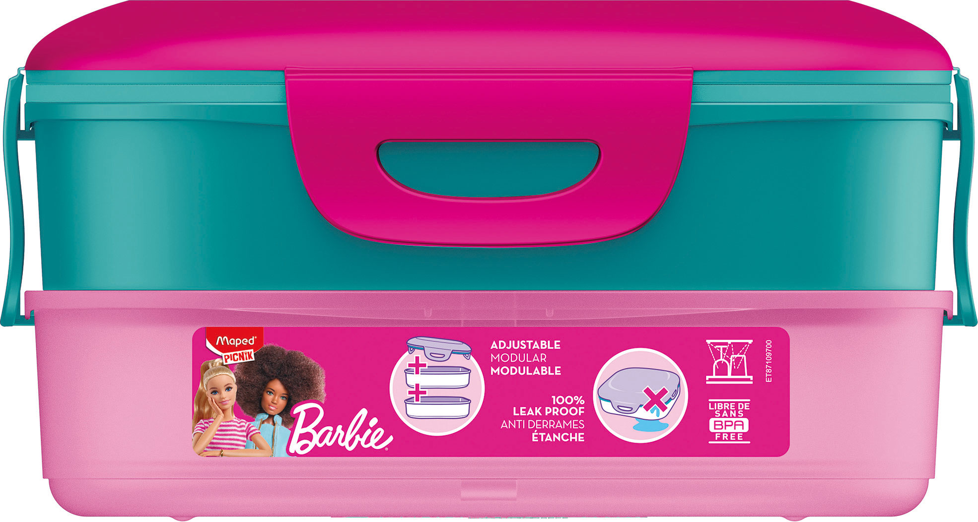 Das PICNIK Sortiment des französischen Herstellers Maped umfasst eine ganze Reihe der Produkte zur Mitnahme und Aufbewahrung von einzelnen Lebensmitteln, Getränken und kompletten Mahlzeiten für Kinder und Erwachsene. Egal ob für die Schule, für das Büro oder für verschiedene Freizeitaktivitäten, die beiden Serien CONCEPT und ORIGINS bieten für viele Anwendungen das richtige Behältnis. Die Lunch-Box CONCEPT BARBIE 2in1 verfügt über 2 getrennte Behältnisse. oberes Fach: 100% auslaufsicher und kann auch für Mahlzeiten mit Saucen oder für Eintöpfe verwendet werden. Die x4 Klappen sorgen für sicher Verschluss der Box. unteres Fach ist für trockene Lebensmittel, wie z.B. Butterbrote, Obst, Gemüse, Müsli oder Kekse geeignet.