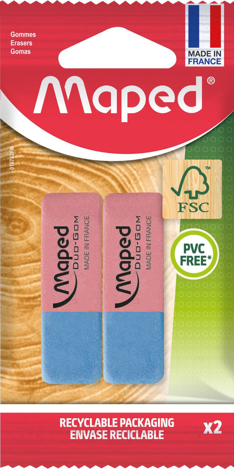 Der Radierer DUO-GOM mittel von dem französischen Schulprodukte-Hersteller Maped wurde unter anderem aus Naturkautschuk von FSC Mix zertifizierten Bäumen hergestellt. Er zeichnet sich durch seine zwei verschiedenen Funktionen aus: Die rote Seite dieses Radierers ist klassischerweise zum Radieren von Bleistiftspuren geeignet, während die blaue Seite dafür gedacht ist, Tinte auszuradieren. Er liegt gut in der Hand, passt in jede Schreibmappe hinein. Selbstverständlich ist dieser Radierer PVC-frei und frei von Phthalaten. Mit der Verwendung vom Naturkautschuk von FSC-zertifizierten Bäumen unterstreicht Maped seine Ambitionen eine nachhaltige Welt für die zukünftigen Generationen zu hinterlassen.