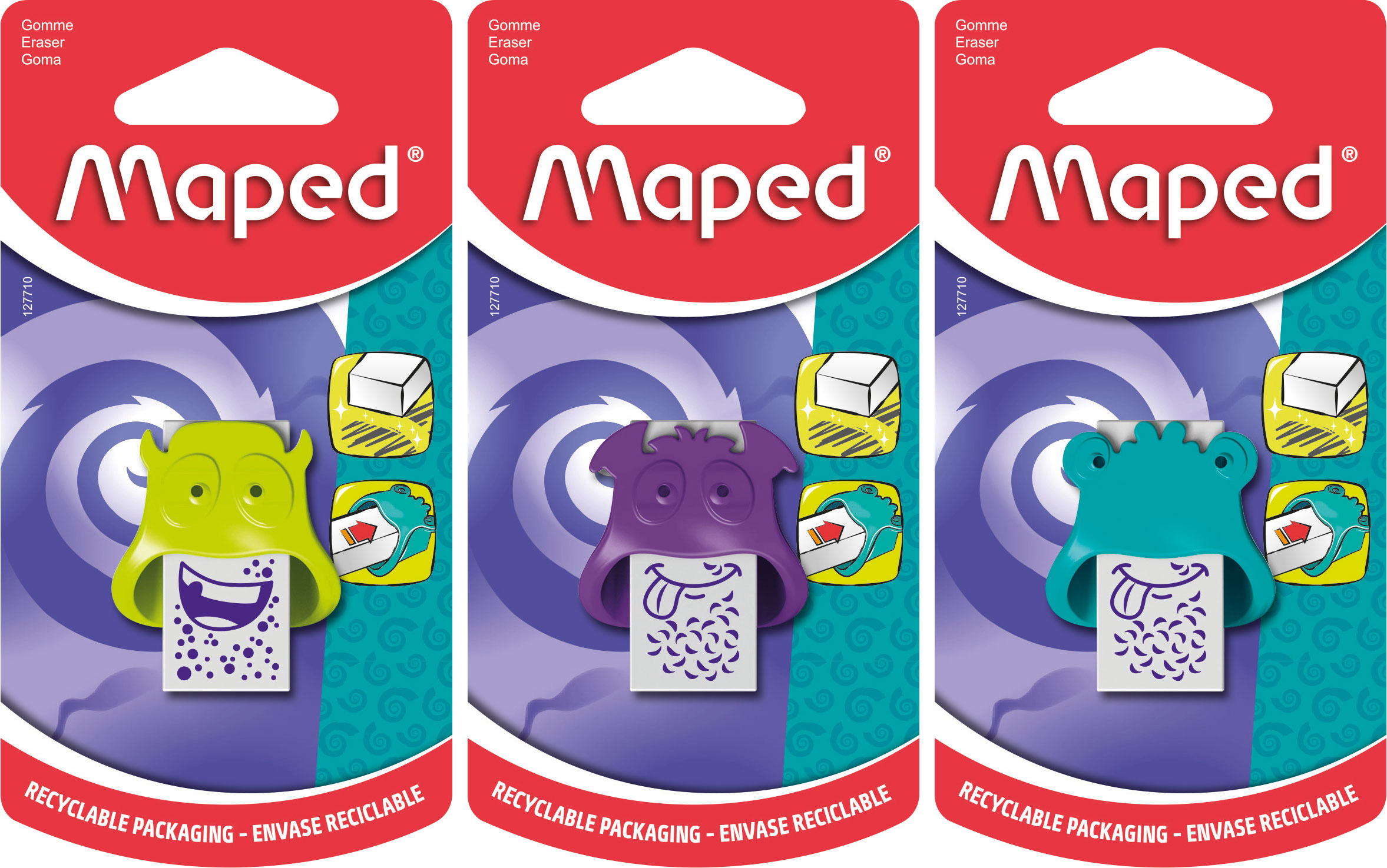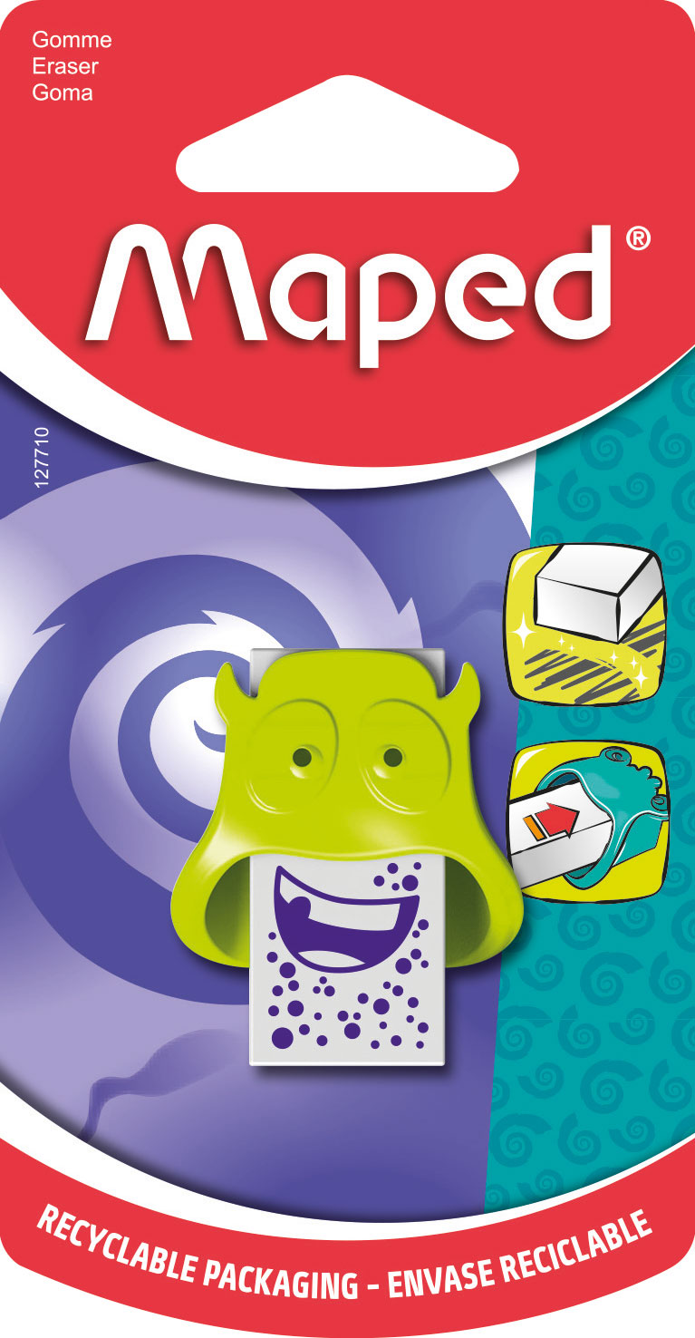 Die effizienten Radierer MONSTER von dem französischen Schulprodukte-Hersteller Maped sind eine ideale Ergänzung der gesammten MONSTER Serie, die aus Anspitzern, Buntstiften und Fasermalern besteht. Alle Produkte sind mit lustigen Monstern verziert.