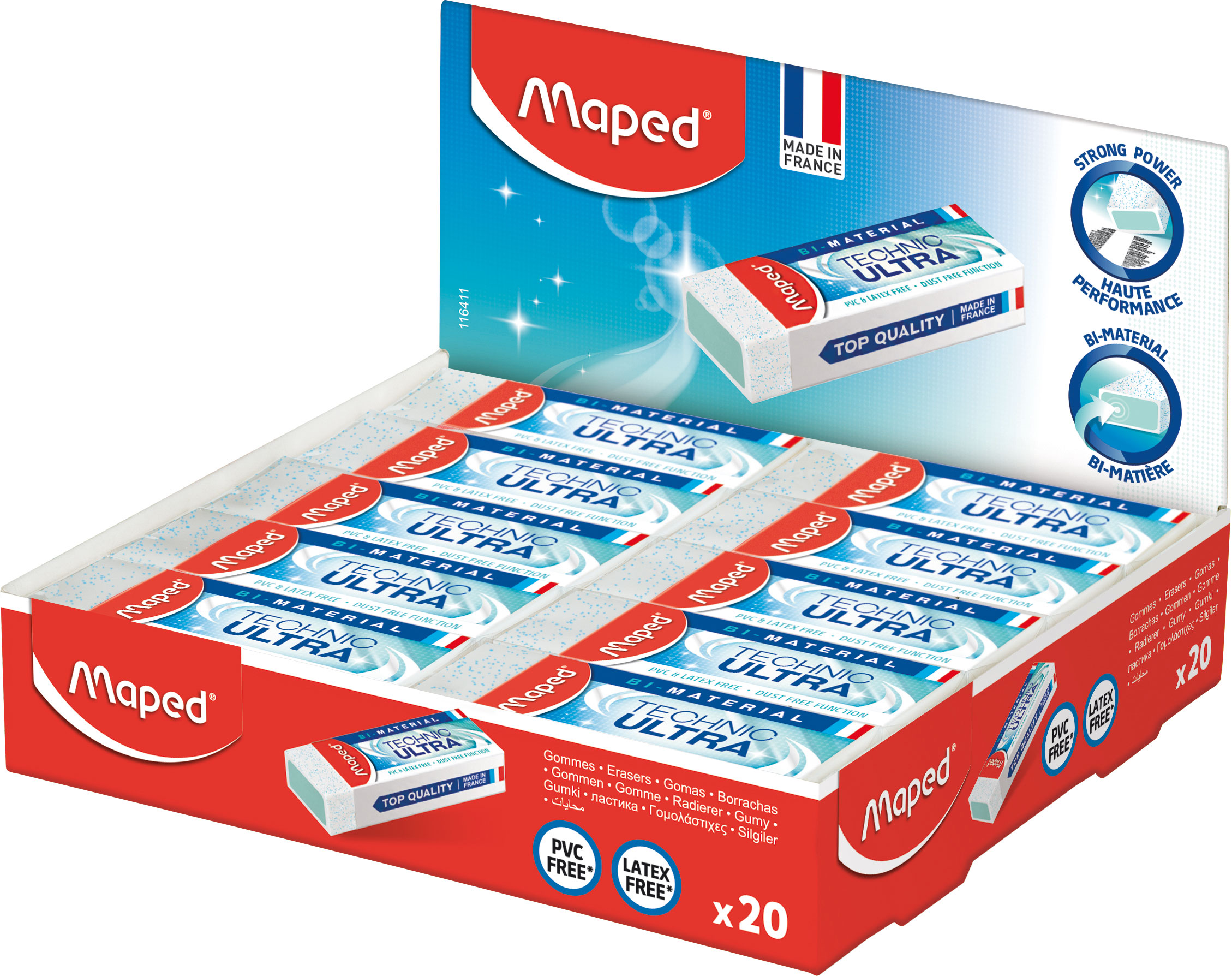 Der Radierer TECHNIC ULTRA von dem französischen Schulprodukte-Hersteller Maped eignet sich ideal für besonders effizientes Radieren von Bleistiftzeichnungen. Der Radierer wurde mit einer ganz neuen Herstelltechnologie produziert und besteht aus zwei Komponenten: – einem weichen Kern – einem stabilen Außen-Mantel Dadurch wird die Radiereffizienz im Vergleich zum klassischen Radierer deutlich erhöht. Beim Radieren entstehen nur wenige Radierrückstände. Den Radierer TECHNIC ULTRA gibt es in der klassischen Radierer Größe 21,5 x 12,0 x 61,0 mm und in der MINI-Ausführung 17,8 x 12,3 x 39 mm