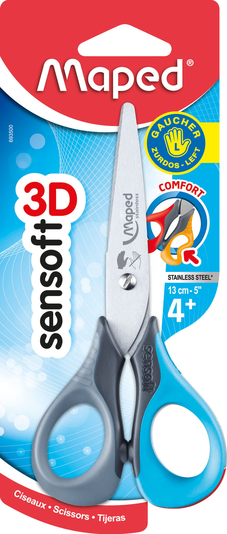 Ergonomie für die Kinder stand bei der Entwicklung von dieser SENSOFT Schere von dem französischen Schulprodukte-Hersteller Maped im Vordergrund. Denn die Griffe sind komplett flexibel und es entsteht kein Druck auf die Finger. Zudem hat Maped 3D Griffe entwickelt, die eine größere Kontaktfläsche zwischen den Fingern und den Griffen bieten und somit eine bessere stabilität beim schneiden gewährleisten. Die SENSOFT Schere gibt es in zwei längen: – 13 cm mit abgerundeten Klingen für die Sicherheit der kleinen Schneidanfänger und – 16 cm mit spitzer Spitze für präzises Schneiden. – Neben der klassischen Version für Rechtshänder gibt es auch eine echte Linkshänder-Variante mit spiegelverkehrt-angebrachten Klingen, so dass das Schneiden für einen Linkshänder intuitiv möglich ist, ohn sich an die Klingen-Anordnung für Rechtshänder anpassen zu müssen. – Zudem gibt es auch die Variante mit einem asymmetrischen Griff wo in ein Griff-Loch 1 Finger rein passt, in das andere 2-3 Finger, was dem Kind noch mehr Stabilität beim Schneiden gibt. – Neben den klassischen Farbkombinationen blau/ dunkelblau, grün/ türkis und pink/ lila gibt es die SENSOFT Schere auch in den Pastellfarben rose, hellblau und flieder.