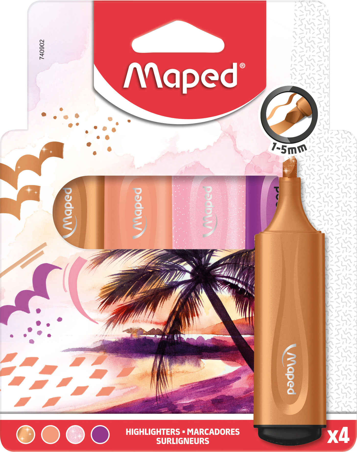 Mit den Textmarker FLUO PEPS THEMEN von dem französischen Schulprodukte-Hersteller Maped kannst Du wählen, welches Thema dir am liebsten gefällt. Für jeden Geschmack gibt es die richtigen Textmarker. Du kannst wählen zwischen 3 verschiedene Themen mit passender Farbzusammenstellung: Ocean, Tropical und Sunset. Diese ultrabrillanten und präzisen Textmarker in trendigen, leuchtende Farben eignen sich besonders zum Erstellen von Bullet-Journals. Durch die abgeschrägte Spitze kann die Stärke der Markierungslinie variable zwischen 1 bis 5 mm gewählt werden. Die Textmarker FLUO PEPS THEMEN sind geruchsarm, wischfest, schattenfrei kopierbar und sind mit lichtresistenter, inkjet-geeigneter Tinte gefüllt. Zudem können die Marker bis zu 4 Stunden geöffnet bleiben, ohne dass die Tinte austrocknet. Die Verpackung dieser Textmarker besteht aus 100% Karton..