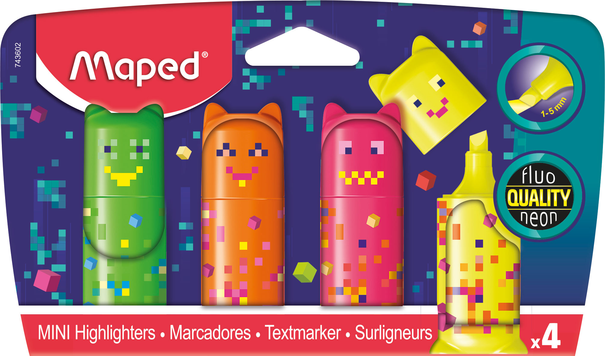 Die Mini-Textmarker PIXEL PARTY von dem französischen Schulprodukte-Hersteller Maped sehen nicht nur cool aus, sondern sind auch reine Markier-Wunder. Denn es befindet sich genau so viel Tinte, wie in den großen Textmarkern FLUO PEPS drin und reicht dementsprechend für sehr viele markierte Flächen. Diese Schachtel enthält 4 Mini-Textmarker zum Thema PIXEL PARTY! Jeder Textmarker stellt eine kleine verpixelte Figur mit verschiedenen Ausdrücken dar. Entdecke die lustige Welt der Pixel auf deinen Schulsachen und dekoriere deine Hefte mit deinen schönsten Textmarkern! Die PIXEL PARTY Produkte von Maped haben ein trendiges und originelles Dekor. Dabei ist jedes Produkt wahrlich ein Effekt- und Action-Spektakel. PIXEL PARTY das sind Produkte mit kleinen Bildpunkten, inspiriert aus dem Bereich Gaming und Metaverse. Praktisch und widerstandsfähig sorgt das PIXEL PARTY Sortiment für ein trendiges Werkzeug, das von Kindern geliebt wird.